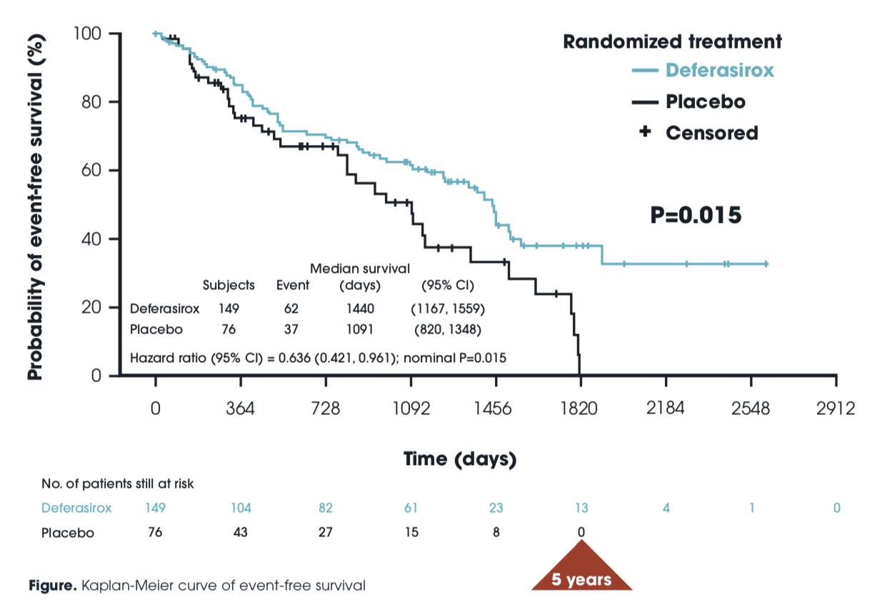 EFS, event free survival; ICT, iron chelation therapy; IPSS, International Prognostic Scoring System; MDS, myelodysplastic syndrome; p, probability. Angelucci E, et al. Blood 2018;132: abstract 234.